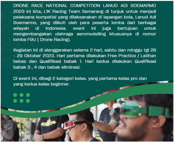 L1K Drone Race Adi Soemarmo Solo 2023 November 10, 2023November 10, 2023 L1K Racing Team Semarang, telah di minta untuk menjadi pelaksana kejuaraan Drone Racing di Lanud Adi Soemarmo Solo , pada tanggal 28-29 Oktober 2023